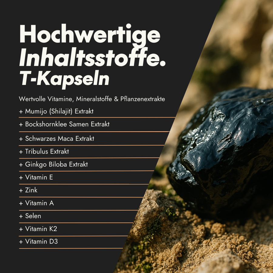 Inhaltsstoffe: Bockshornklee Samen (Fenugreek Seeds) Extrakt (40%), Mumijo (Shilajit) Extrakt (23%), schwarzes Maca Extrakt (12 %), Kapselnhülle: Hydroxypropylmethylcellulose, Ginkgo Biloba Extrakt (6%), Tribulus Extrakt (6%), DL-AlphaTocopherylacetat, Zinkgluconat, Natriumselenit, Cholecalciferol, Vitamin A Acetate, Menachinon-7.