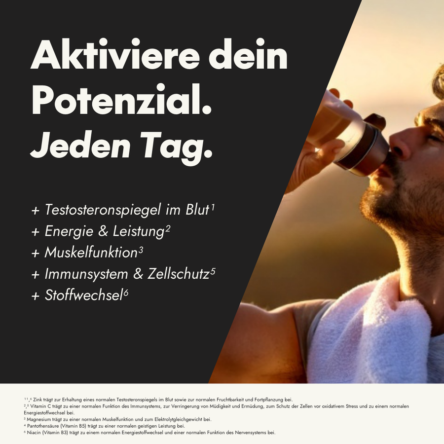 • Zink trägt zur Erhaltung eines normalen Testosteronspiegels bei und unterstützt so deine hormonelle Balance. Zusätzlich trägt es zu einem normalen Immunsystem und zum Schutz deiner Zellen vor oxidativem Stress bei.