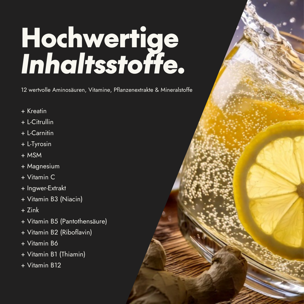 Inhaltsstoffe: Kreatin Monohydrat, L-Citrullin DL-Malat, Magnesiumcitrat, L-Carnitin Tartrat, L-Tyrosin, Methylsulfonylmethan (MSM), Säuerungsmittel: Citronensäure, Zitrone-Ingwer Aroma, L-Ascorbinsäure, Stevia Extrakt (1%), Ingwer Extrakt (1%), Zinkcitrat, Nicotinamid, D-Calcium Pantothenat, Pyridoxal-5-Phosphat, Natrium Riboflavin-5-Phosphat, Thiamin Hydrochlorid, Methylcobalamin.