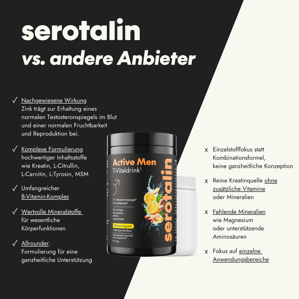 Wie du siehst, sind ein leistungsfähiger Körper und ein entspannter Kopf das Ergebnis einer ausgewogenen Nährstoffversorgung. Der Active Men T-Vitaldrink¹ von serotalin liefert dir genau das – mit einer ausgeklügelten Formel, die wissenschaftlich fundiert ist.