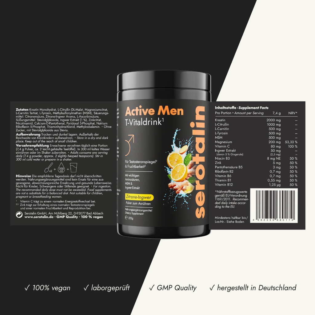 Mehr Energie¹. Mehr Fokus⁵ . Mehr Leistung⁶. Der serotalin Active Men T-Vitaldrink¹ ist die effektive Ergänzung für aktive Männer, die ihre ganzheitliche Leistungsfähigkeit gezielt optimieren möchten. Ob bei intensivem Training, für stressige Tage oder ambitionierte Ziele: Dein Körper braucht die richtigen Nährstoffe, um auf Top-Niveau zu funktionieren. Der serotalin Active Men T-Vitaldrink¹ kombiniert hochwertige Aminosäuren, Vitamine und Mineralstoffe in einer einzigartigen Formel.