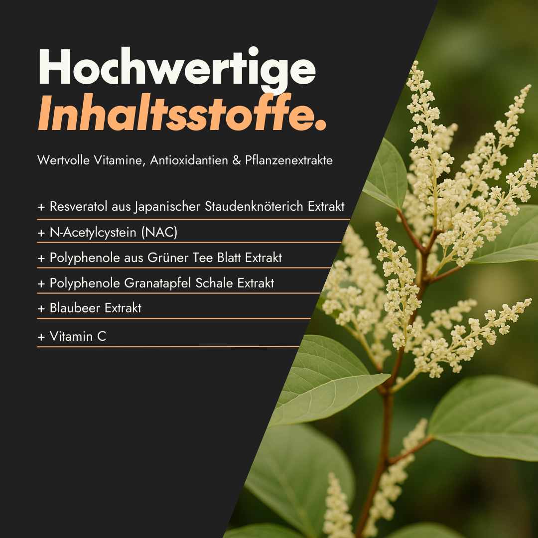 Inhaltsstoffe: Japanischer Staudenknöterich Extrakt (25%), N-Acetylcystein, Kapselhülle: Hydroxypropylmethylcellulose, Blaubeere Frucht Extrakt (12%), Granatapfel Schale Extrakt (12%), Grüner Tee Blatt Extrakt (12%), L-Ascorbinsäure.