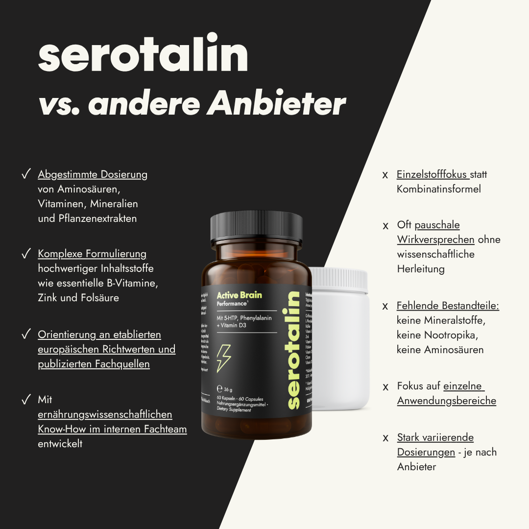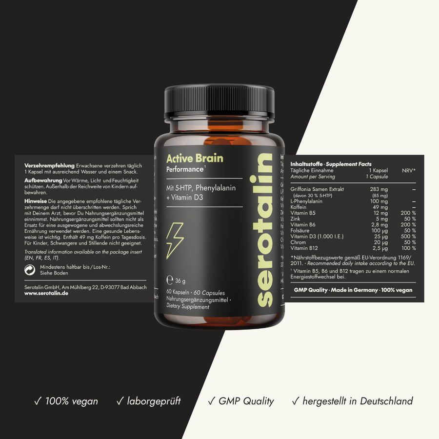 Do you want to be fully present every day – at university, at work, and even during sports? Do you want to be more focused and structured throughout your day? Are you looking for a natural supplement that targets exactly where true performance begins – namely, in the mind? That's exactly what serotalin® Active Brain Performance¹ does – with an evidence-based formula that combines carefully selected ingredients in a convenient capsule – perfect for your everyday life.