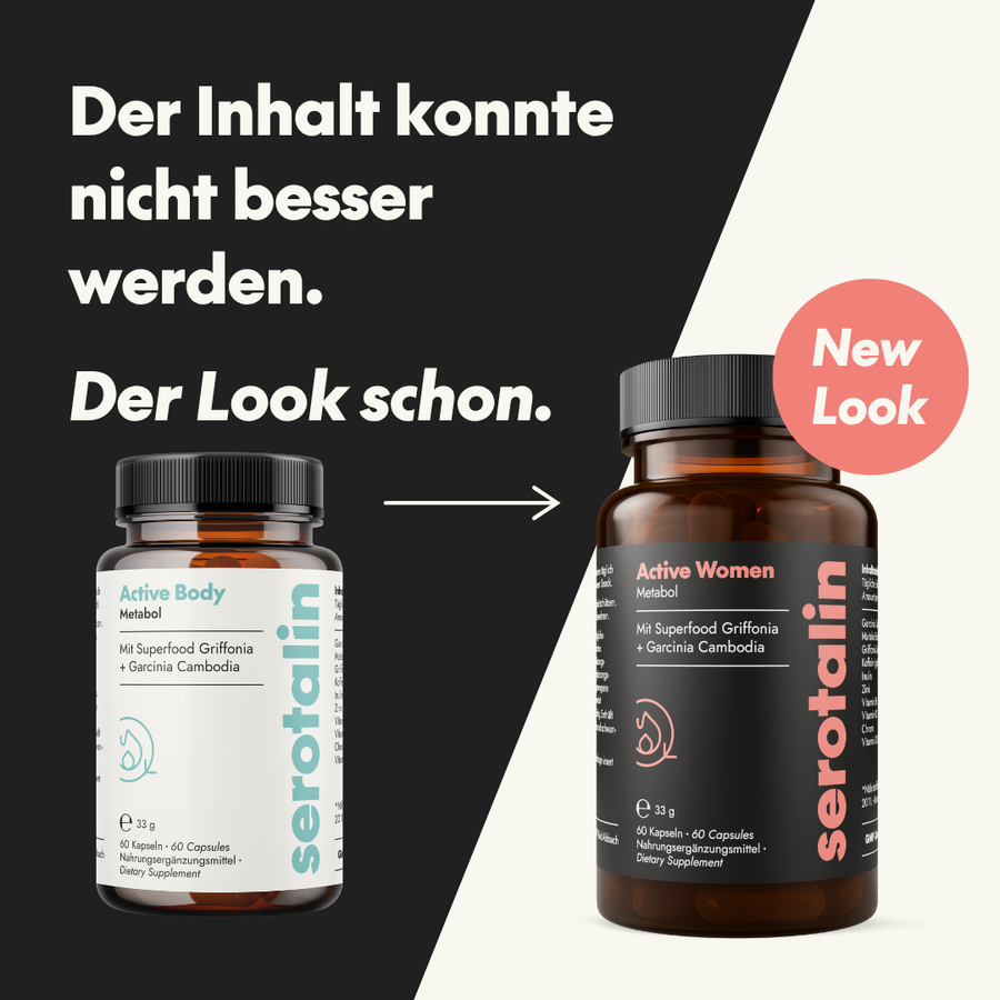 serotalin® ACTIVE BURN supports your metabolism ¹⁺², fatty acid metabolism ³, blood sugar levels ⁴ and your energy levels ⁶⁺⁷. The effective combination of active ingredients includes Garcinia Cambogia, Griffonia seeds, valuable vitamins, caffeine and maitake as well as the essential trace elements chromium and zinc.