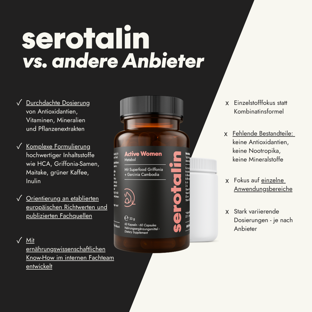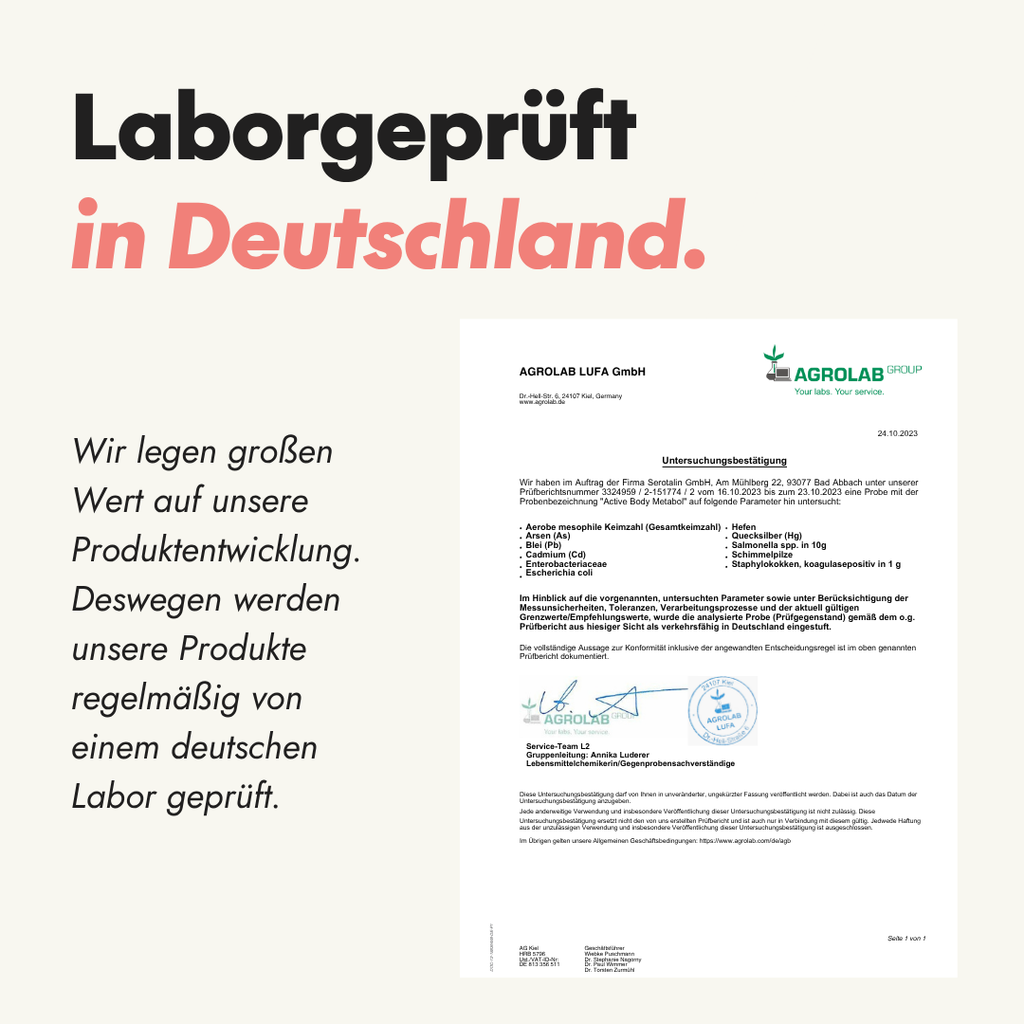 All serotalin® products are carefully manufactured and produced in Germany. The ingredients are checked for heavy metals and pesticides, so you receive a product of the highest quality.