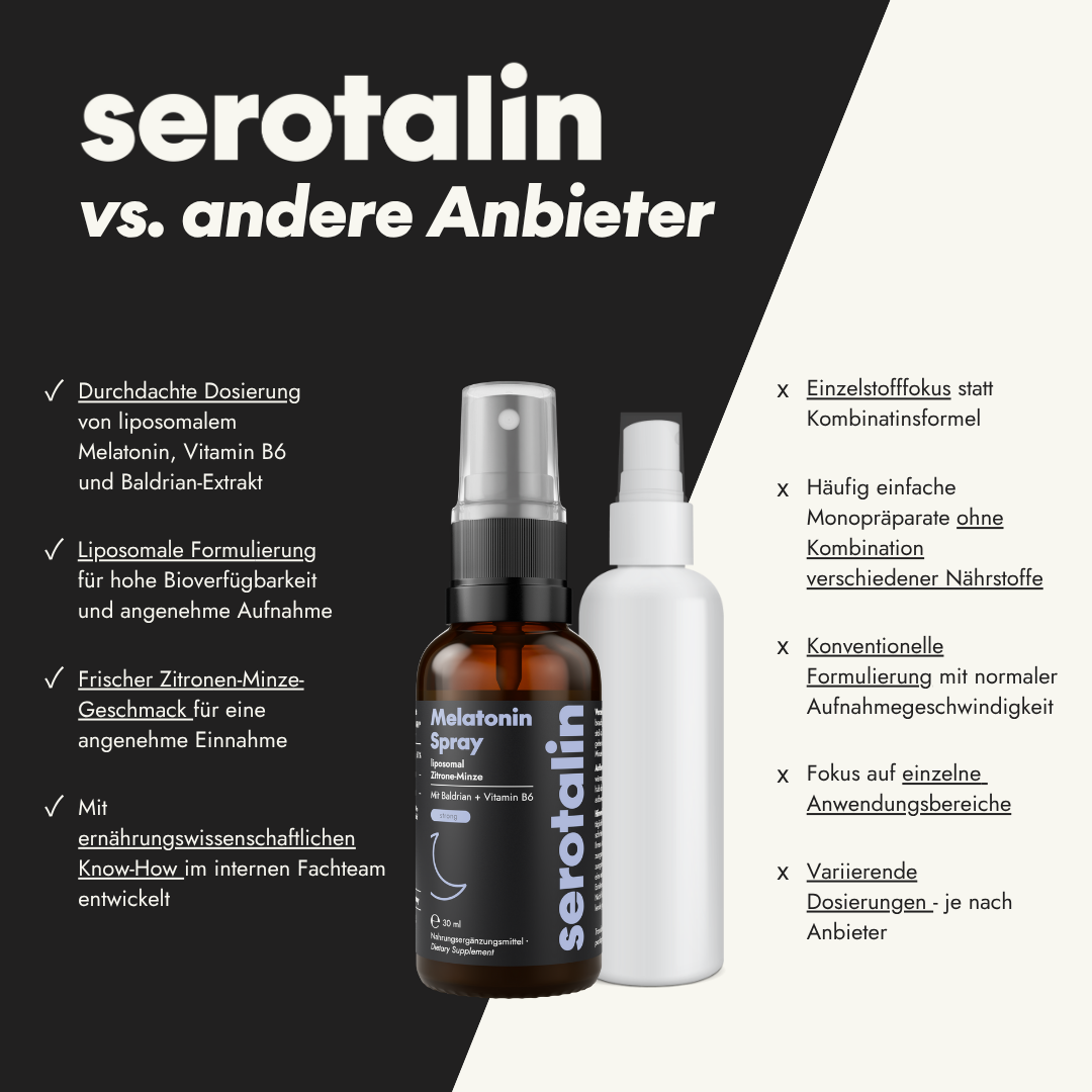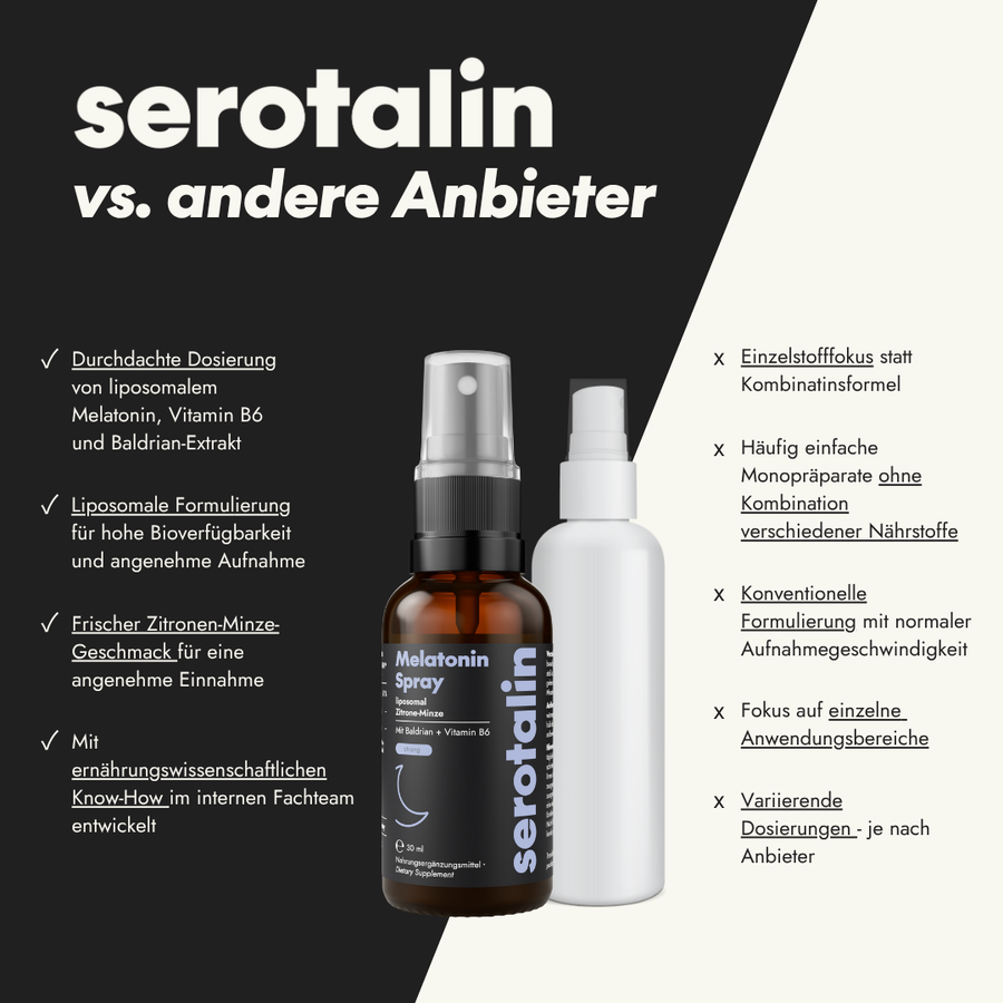 Say goodbye to tossing and turning in bed for hours! serotalin® MELATONIN SPRAY, with its powerful combination of melatonin and valerian, helps you fall asleep faster¹ so you can start the next day full of energy. Thanks to its liposomal formulation and the resulting higher bioavailability, the spray works quickly. This makes it up to 46 times more effective than other melatonin preparations.