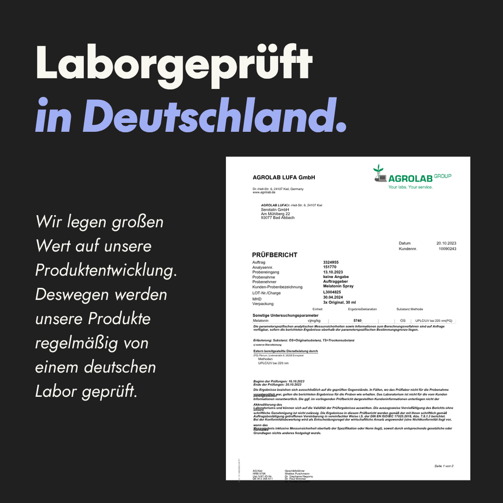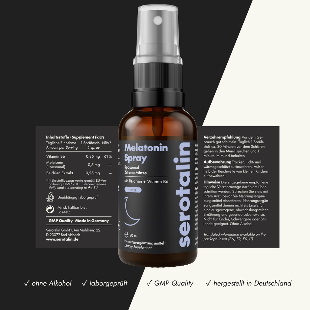 At serotalin®, we want to help you improve your performance and increase your happiness. That's why we partner with progressive companies and use innovative technologies to manufacture our products. The Melatonin Sleep Spray is made in Germany and meets high quality standards. It works naturally and makes it easier for you to fall asleep.