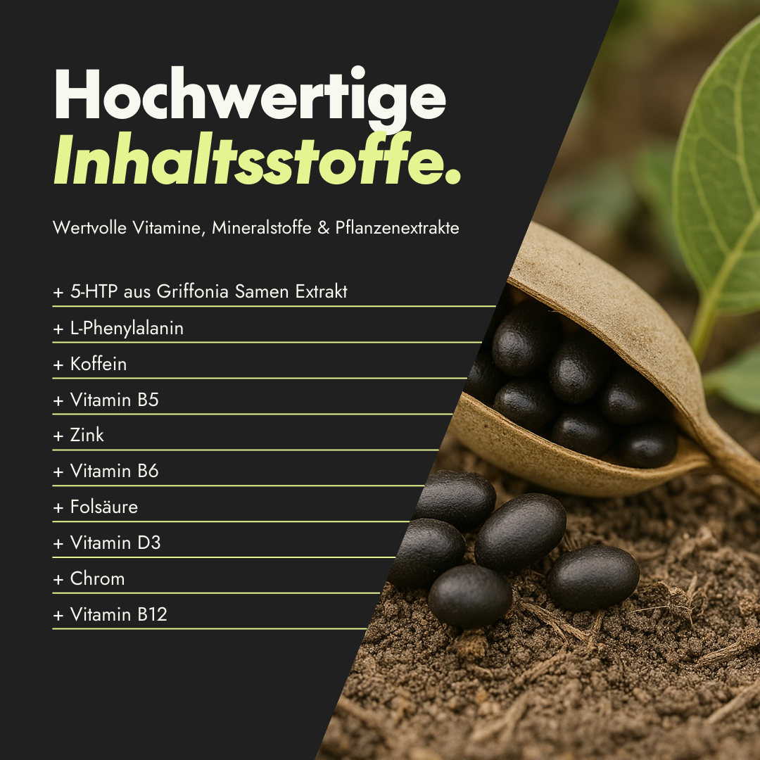 Die Kapseln enthalten eine durchdachte Mischung aus pflanzlichen und bioaktiven Komponenten mit hoher Bioverfügbarkeit: Griffonia simplicifolia (Samenextrakt), L-Phenylalanin, natürliches Koffein aus Coffea Robusta sowie Vitamin B5, B6, B12, Folsäure, Zink, Chrom und Vitamin D3.