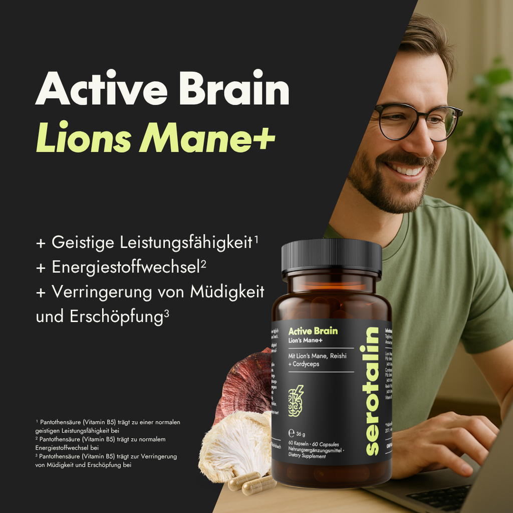 Du interessierst dich für Traditionelle Chinesische Medizin (TCM) und möchtest asiatische Vitalpilze in deinen Alltag integrieren? Dann könnten unsere serotalin Active Brain Lions Mane+ gut zu dir passen. Sie enthalten hochwertige Extrakte aus drei sorgfältig ausgewählten Pilzen: Lions Mane, Cordyceps Sinensis und Reishi – kombiniert mit Vitamin B5. Einfach zwei Kapseln täglich einnehmen – praktisch, unkompliziert und optimal für unterwegs.