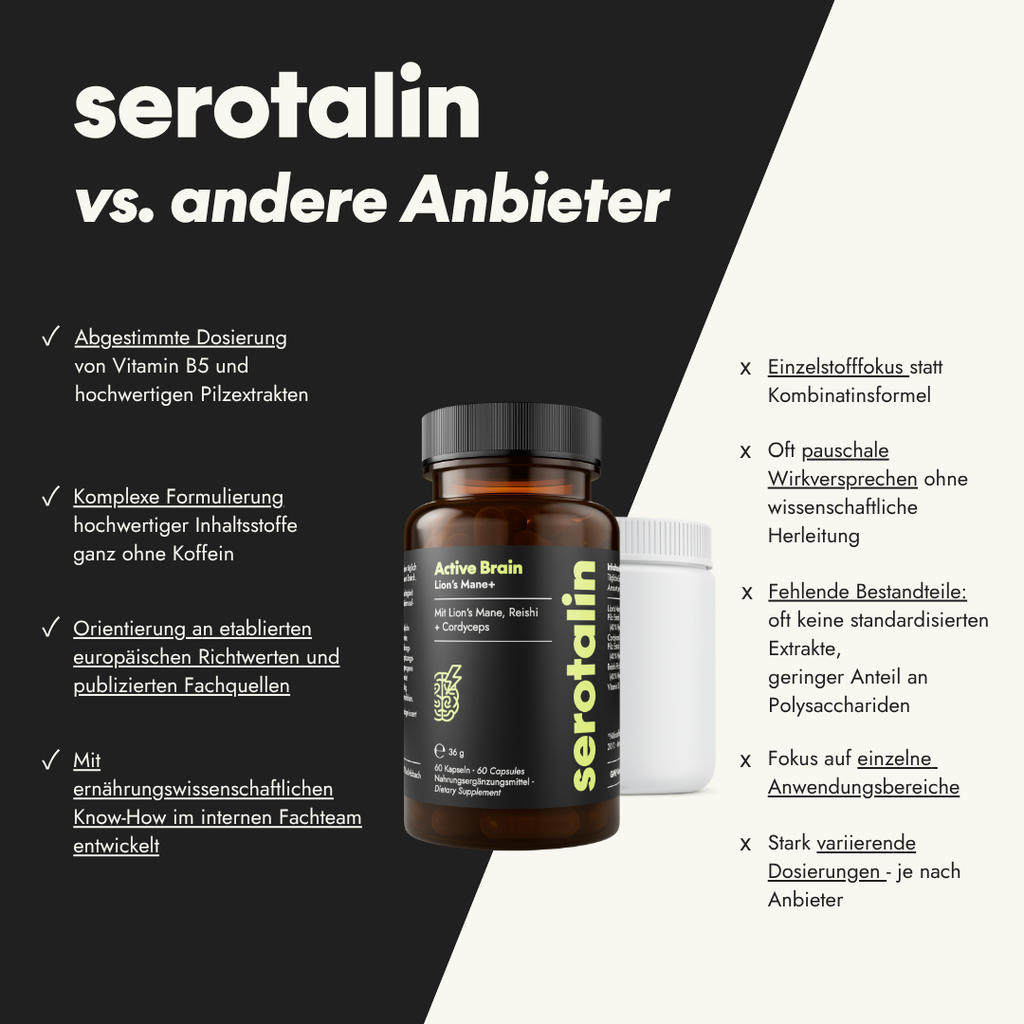 Unser Qualitätsversprechen: serotalin Active Brain Lions Mane+ Kapseln enthalten ausschließlich ausgewählte, natürliche Inhaltsstoffe. Auf überflüssige Zusätze wird bewusst verzichtet.